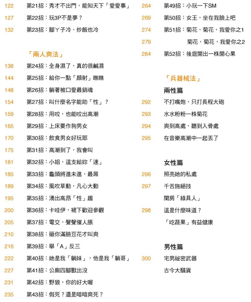 首练“心法”︰破除男女双方对于性观念的错误迷思。自古以来女性对于自身裸体的羞怯与恐惧,该如何释放?男性是否懂得如何将心比心、疼惜女性?再练“功法”︰举凡招式、体位、力道拿捏、创意出击……皆有精彩例证与招式建议。锻鍊脚趾的肌肉神经,竟能成就“吸精大法”?穿上高跟鞋做爱,意外达到阴道最佳摩擦效果?平时多喝珍珠奶茶,男性就能练就最佳舌功?随时保持脚的温度,竟是活化性慾的小撇步?举凡生活常见实例,稍加活用立刻成为最佳妙招。